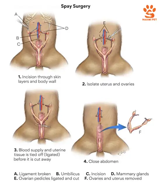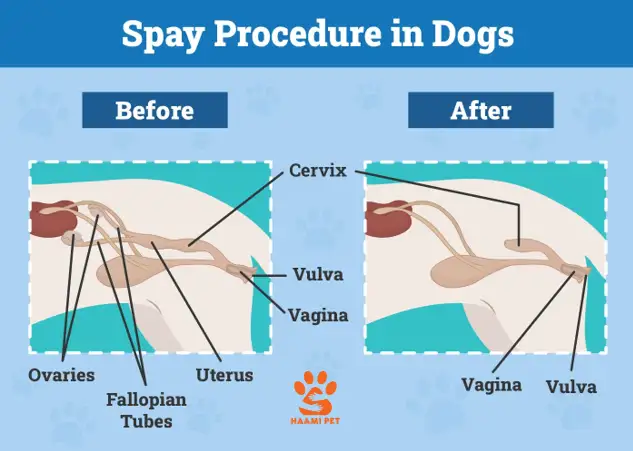 - در سگهای ماده: این روش که اواریوهیسترکتومی(Ovariohysterectomy) نام دارد، شامل برداشتن تخمدانها و رحم از طریق یک برش در شکم است. این کار از بارداری جلوگیری کرده و خطر ابتلا به بیماریهای تولیدمثلی را کاهش میدهد.