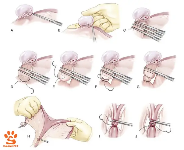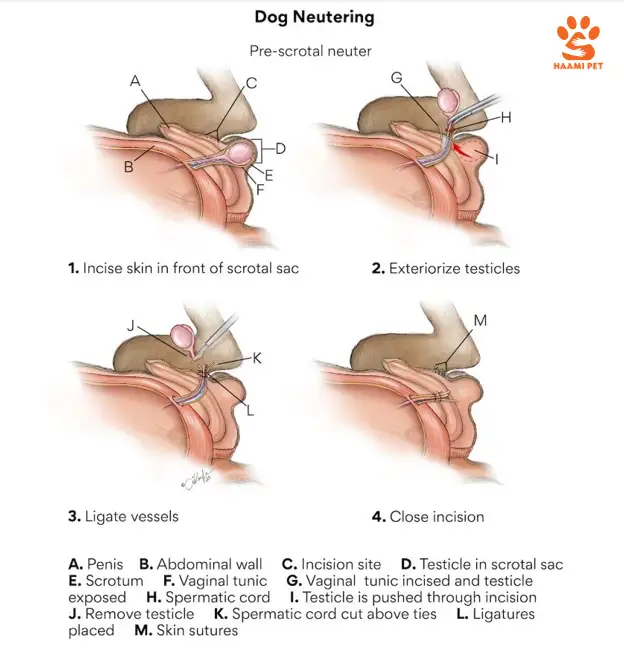 قبل از جراحی، دامپزشک معاینات لازم را برای اطمینان از سلامت عمومی سگ انجام میدهد. همچنین، به صاحب سگ گفته میشود که حداقل 8 ساعت قبل از جراحی، از دادن آب و غذا به سگ خودداری کند و سگ ناشتا باشد. پس از بیهوشی، دامپزشک برشی در ناحیه موردنظر ایجاد کرده و اندامهای تولیدمثلی را خارج میکند. پس از بستن رگهای خونی و اطمینان از عدم خونریزی، زخم بخیه زده شده و پانسمان میشود. پس از جراحی، سگ تحت نظر دامپزشک باقی میماند تا اثرات بیهوشی از بین برود و سپس برای استراحت و بهبودی به خانه منتقل میشود.