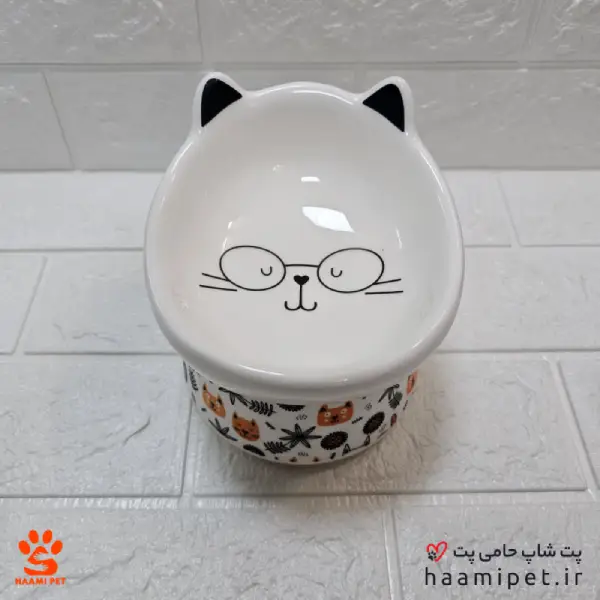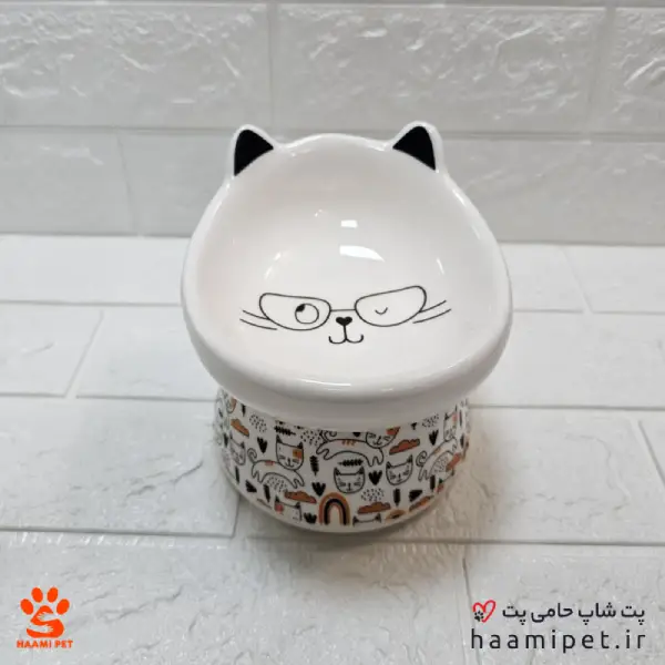 ظرف آب و غذا سگ و گربه سرامیکی پایه دار طرح صورت گربه عینکی