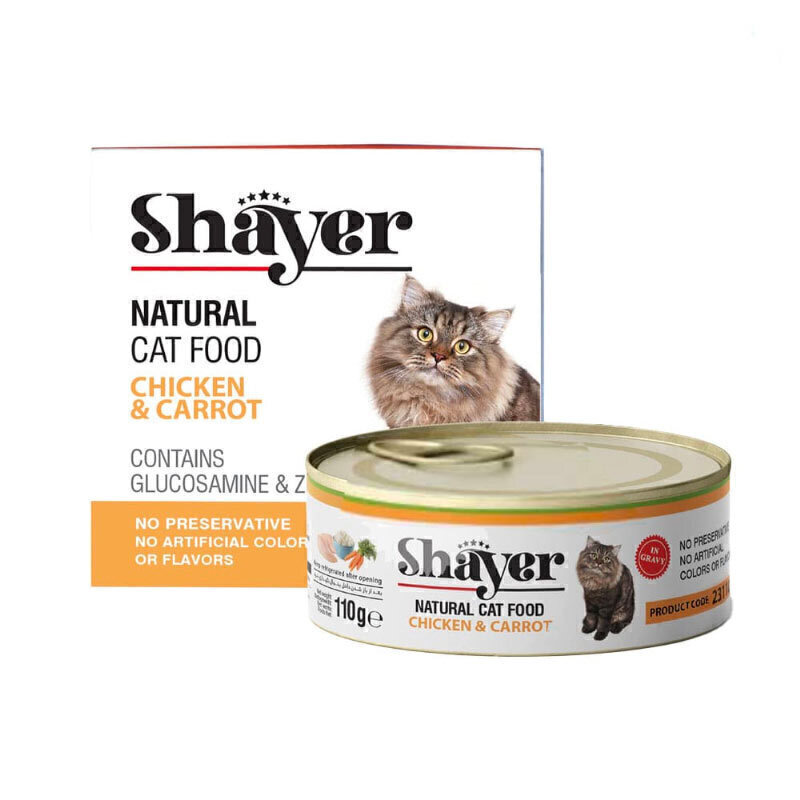 کنسرو گربه شایر با طعم مرغ و هویج در سس گوشت بصورت نچرال شامل تکههای طبیعی مرغ همراه با تکه هایی طبیعی از هویج و کمی برنج درآب غلیظ شده سس گوشت است.