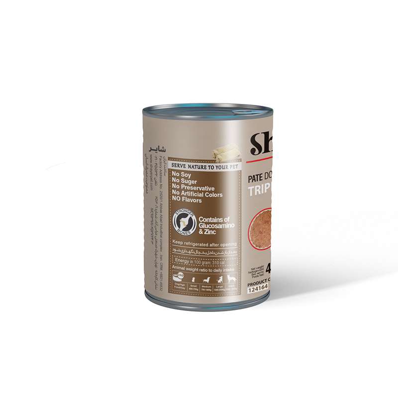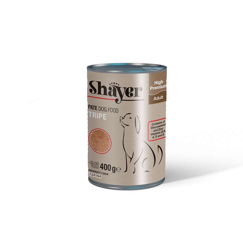 کنسرو سگ “شایر” با طعم سیرابی حاوی امولسیون یکنواخت شدهی سیرابی همراه با جگر، کمی برنج، هویج، نخود سبز، کلم، استخوان و سایر مواد غذایی طبیعی میباشد. سیرابی سرشار از زینک , گلوکوزامین است که موجب استحکام و رشد استخوان می شود.