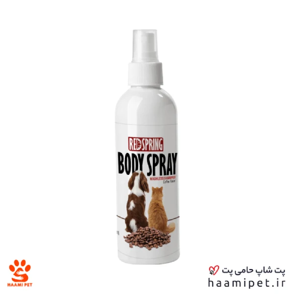 اسپری تمیز کننده بدن رد اسپرینگ با عصاره قهوه موجود در پت شاپ حامی پت بدون نیاز به آبکشی است و بر پایه نانو نقره می‌باشد.