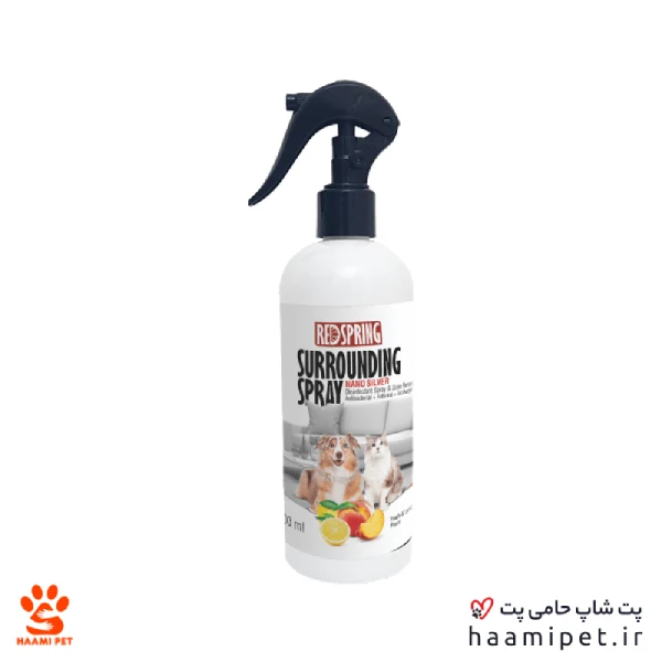 محلول ضد عفونى كننده محیط با عصاره هلو و لیمو بر پایه نانو نقره، از بین برنده بو و رد ادرار فرموله شده برای ضد عفونى كردن و تمیز كردن لوازم، اكسسورى، ظرف غذا جاى خواب، باكس، قفس و محیط زندگی سگ و گربه خانگى.