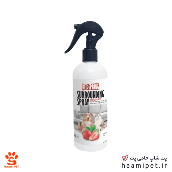 محلول ضد عفونى كننده محیط رد اسپرینگ با عصاره توت فرنگی بر پایه نانو نقره، از بین برنده بو و رد ادرار فرموله شده برای ضد عفونى كردن و تمیز كردن لوازم، اكسسورى، ظرف غذا جاى خواب، باكس، قفس و محیط زندگی سگ و گربه خانگى شما.