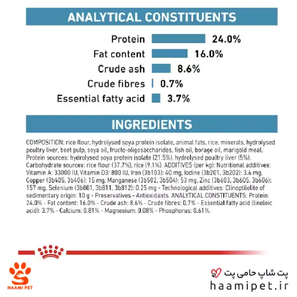 غذای خشک سگ نژاد کوچک هایپوآلرژیک رویال کنین، موجود در پت شاپ حامی پت، یک غذای کامل می‌باشد که برای تمام سگ های نژاد کوچک مناسب می‌باشد و برای درمان آلرژی غذایی ساخته شده است و به سلامتی پوست نیز کمک می‌کند.