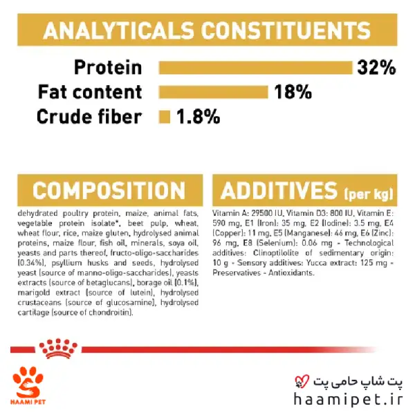 پروتئین مرغ خشک، ذرت، چربی حیوانی، پروتئین گیاهی، تفاله چغندر، گندم، آرد گندم، برنج، گلوتن ذرت، پروتئین حیوانی هیدرولیز شده، آرد ذرت، روغن ماهی، مواد معدنی، روغن سویا، فروتولیگو ساکاریدها، پوسته و دانه های پسیلیوم، مخمر هیدرولیز شده (منبع مانو-الیگو ساکاریدها)، عصاره مخمرها (منبع بتاگلونها)، روغن گل گاوزبان، عصاره گل همیشه بهار (منبع لوتئین)، سخت پوستان هیدرولیز شده ( منبع گلوکوزامین)، غضروف هیدرولیز شده (منبع کندرویتین)، ویتامین A، ویتامین D3، آهن، روی، ید، سلنیوم، عصار یوکا، کلینوپتولیت، آنتی اکسیدان و مواد نگهدارنده مجاز.