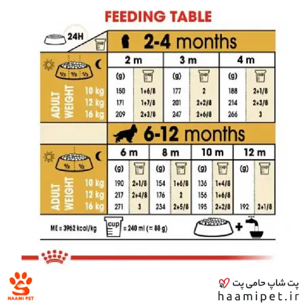 • مقدار غذایی که باید روزانه به توله سگتان داده شود ممکن است بر اساس شرایط زندگی سگتان، شخصیت و فعالیت وی و درجه حرارت خارج از منزل متفاوت باشد.