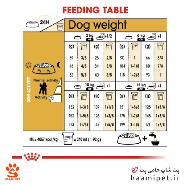 - مقدار غذایی که باید روزانه به سگتان داده شود ممکن است بر اساس شرایط زندگی سگتان، شخصیت و فعالیت وی و درجه حرارت خارج و داخل منزل متفاوت باشد.